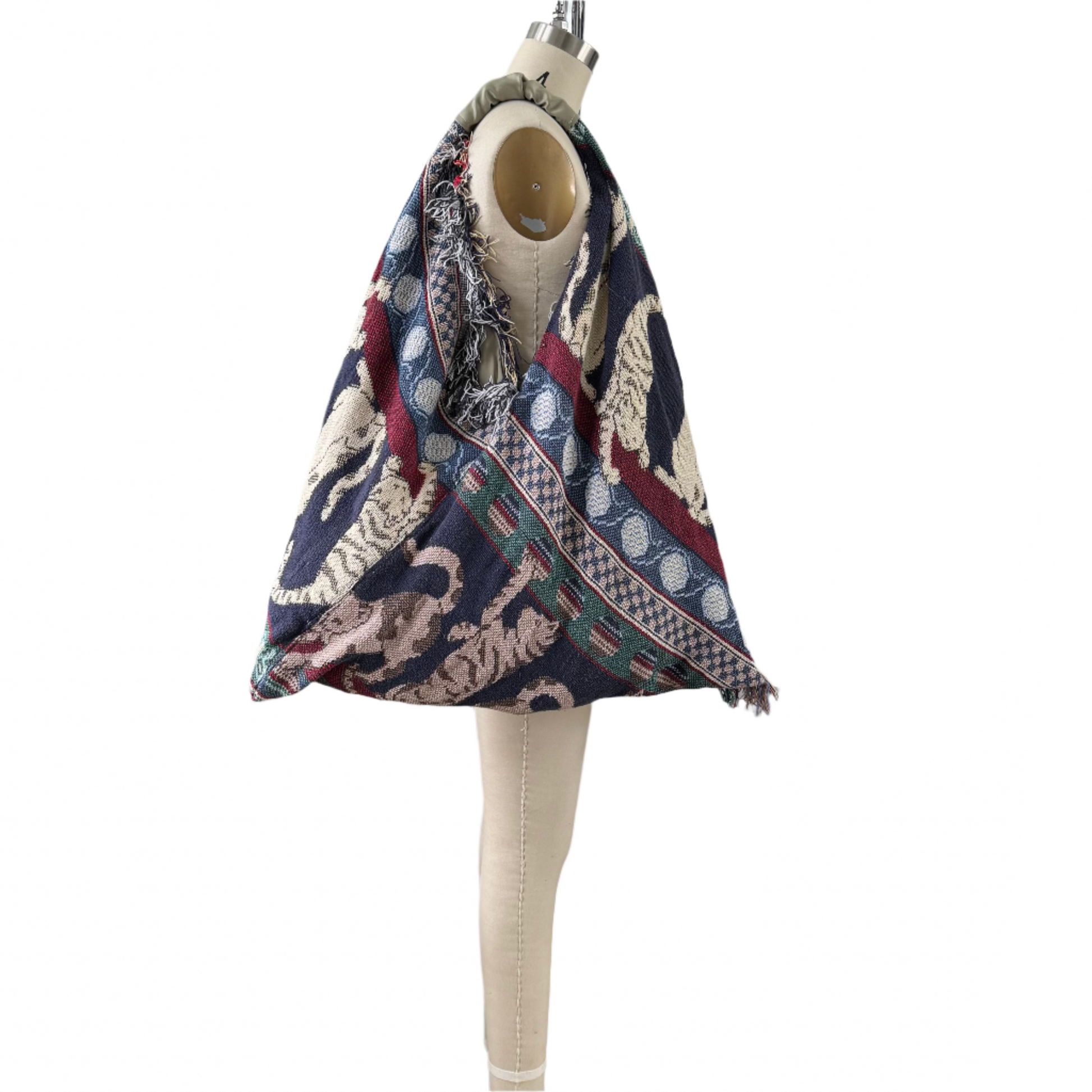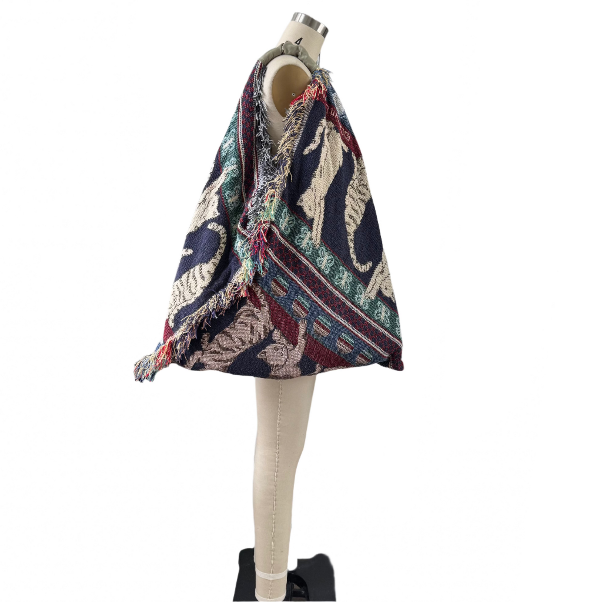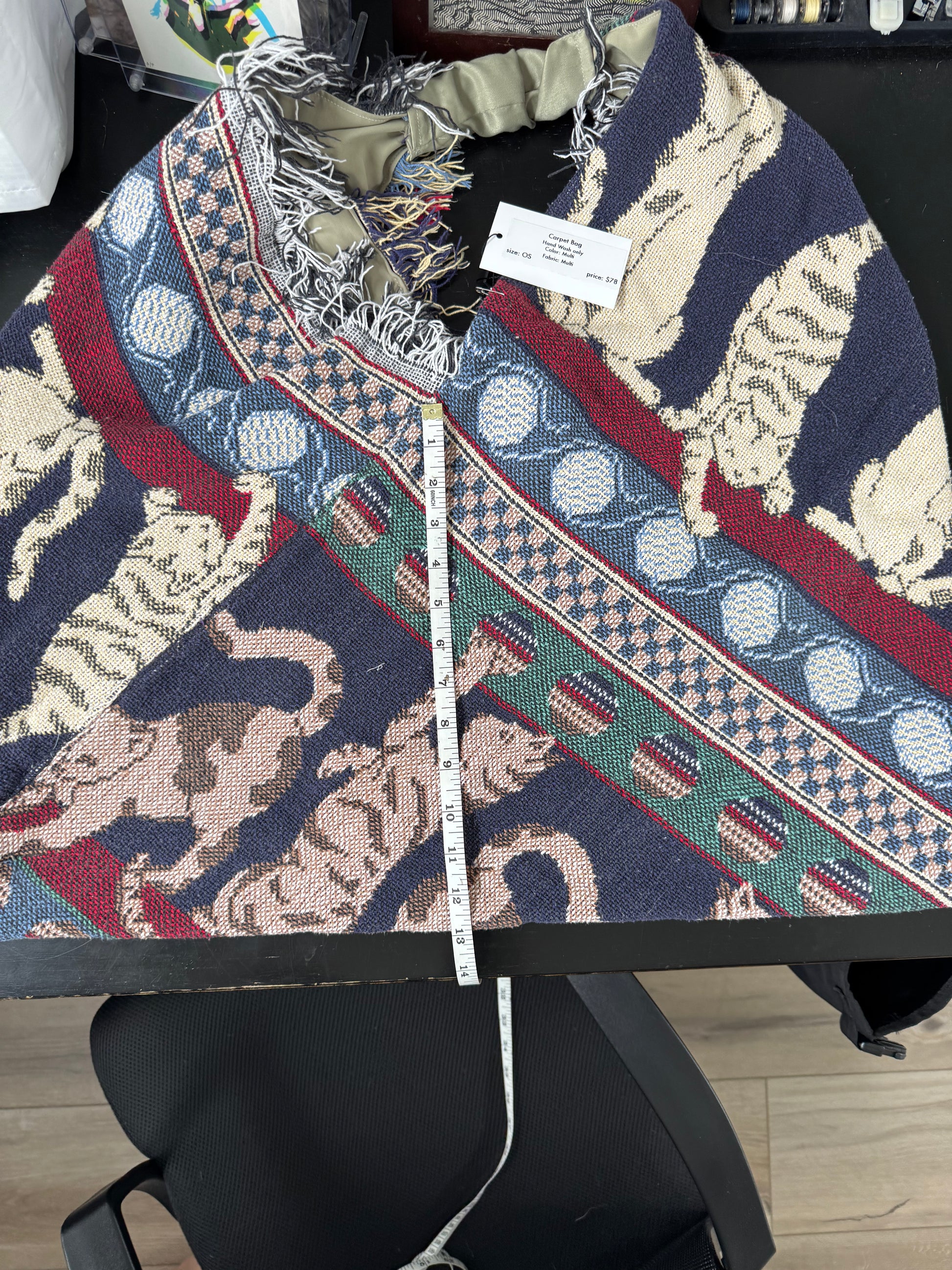 Crafted with a zero-waste design philosophy, this one-of-a-kind bag is made from a reimagined jacquard blanket featuring a whimsical cat motif and soft, decorative tassels. Fully lined for structure and durability, it blends playful charm with conscious construction. Each piece is thoughtfully cut to minimize textile waste—no two are exactly alike. Whether you're toting essentials or making a bold statement, this carryall is a cozy companion stitched from stories and sustainability.