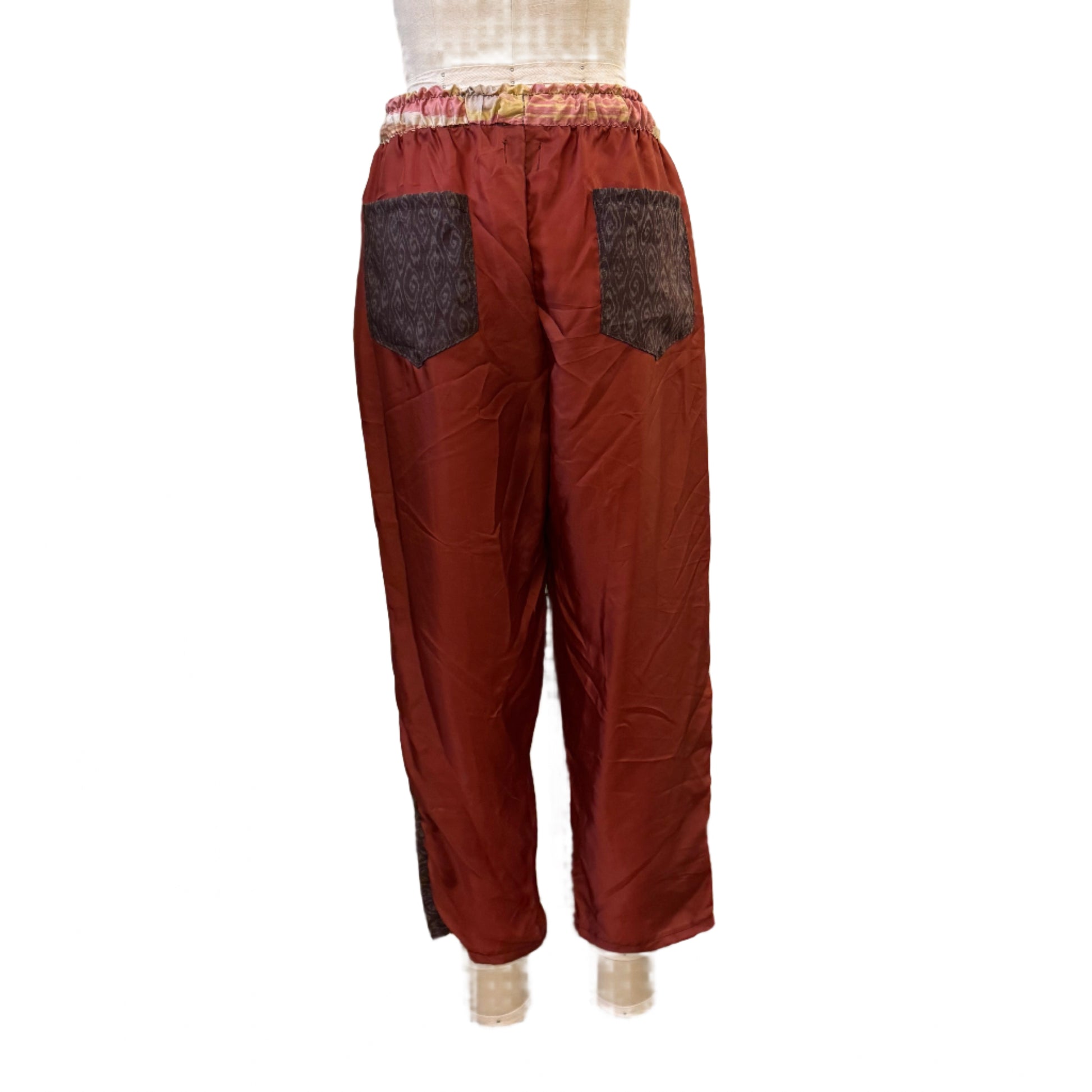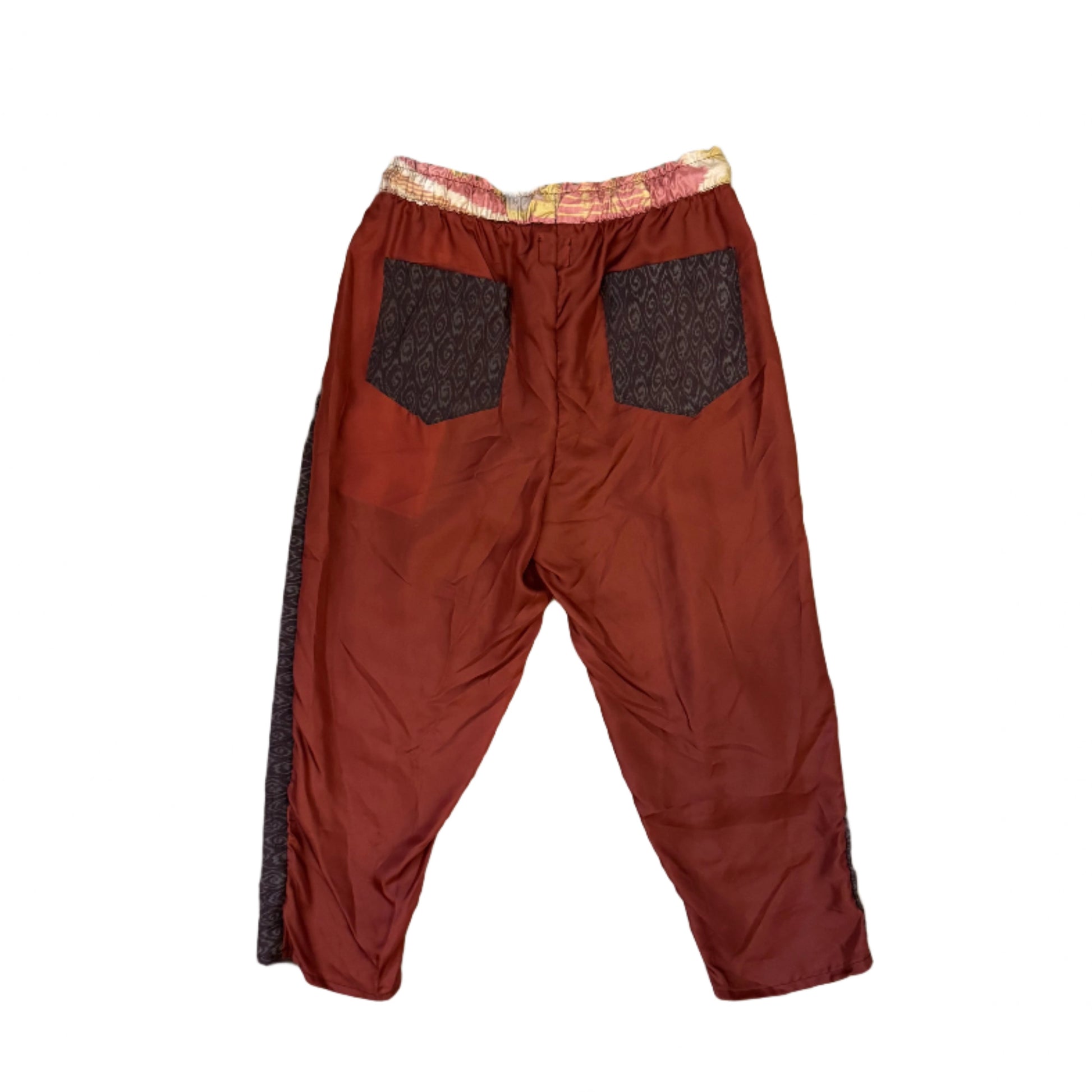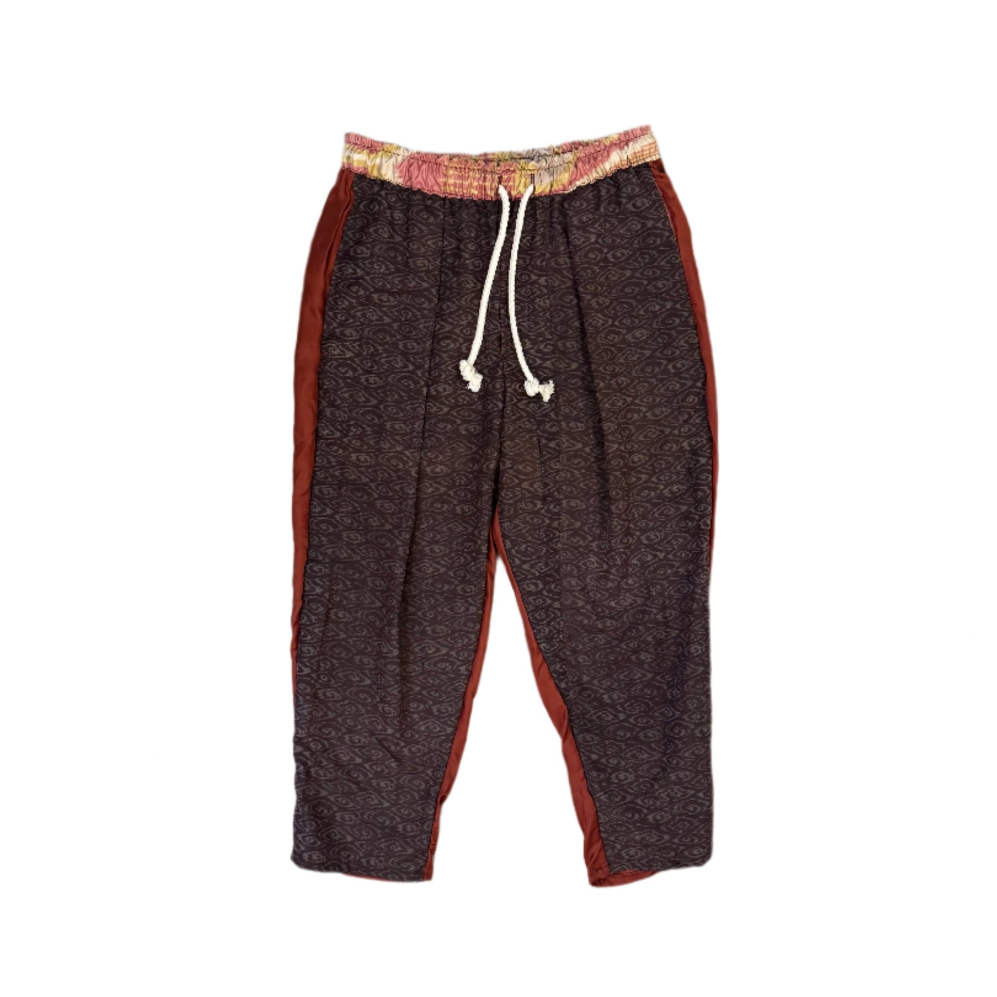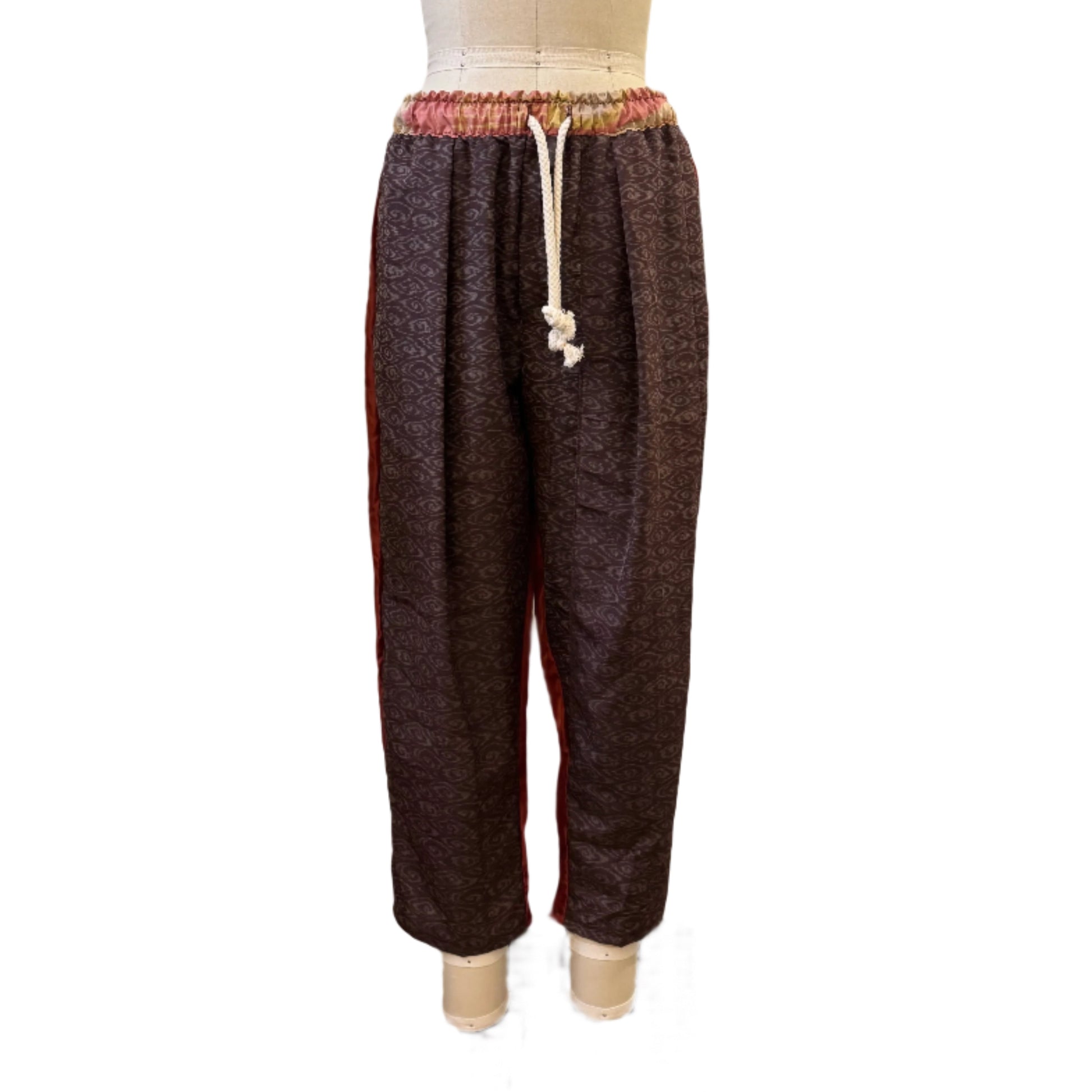 Oversized upcycled drawstring pants featuring a relaxed fit and unique pleated front design. Crafted from repurposed materials, these pants showcase a striking combination of patterns and contrasting panels, blending comfort with a bold aesthetic. The adjustable drawstring waistband ensures a customizable fit, while the two back patch pockets add practicality and flair. Perfect for casual outings or lounging, these sustainable pants are both stylish and versatile.