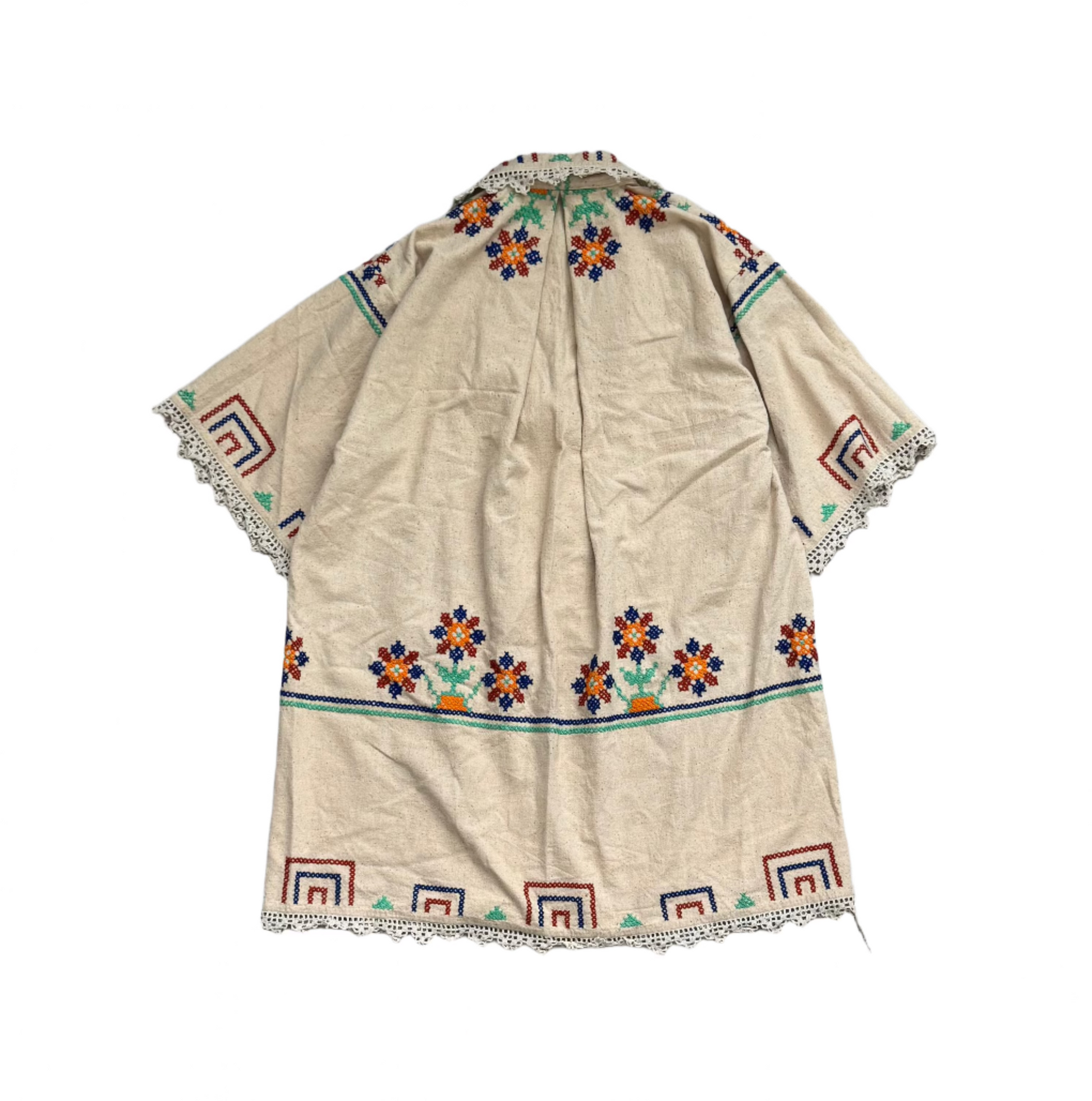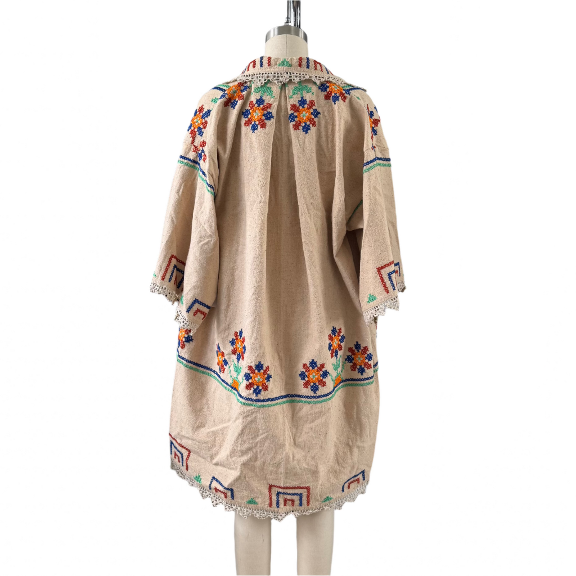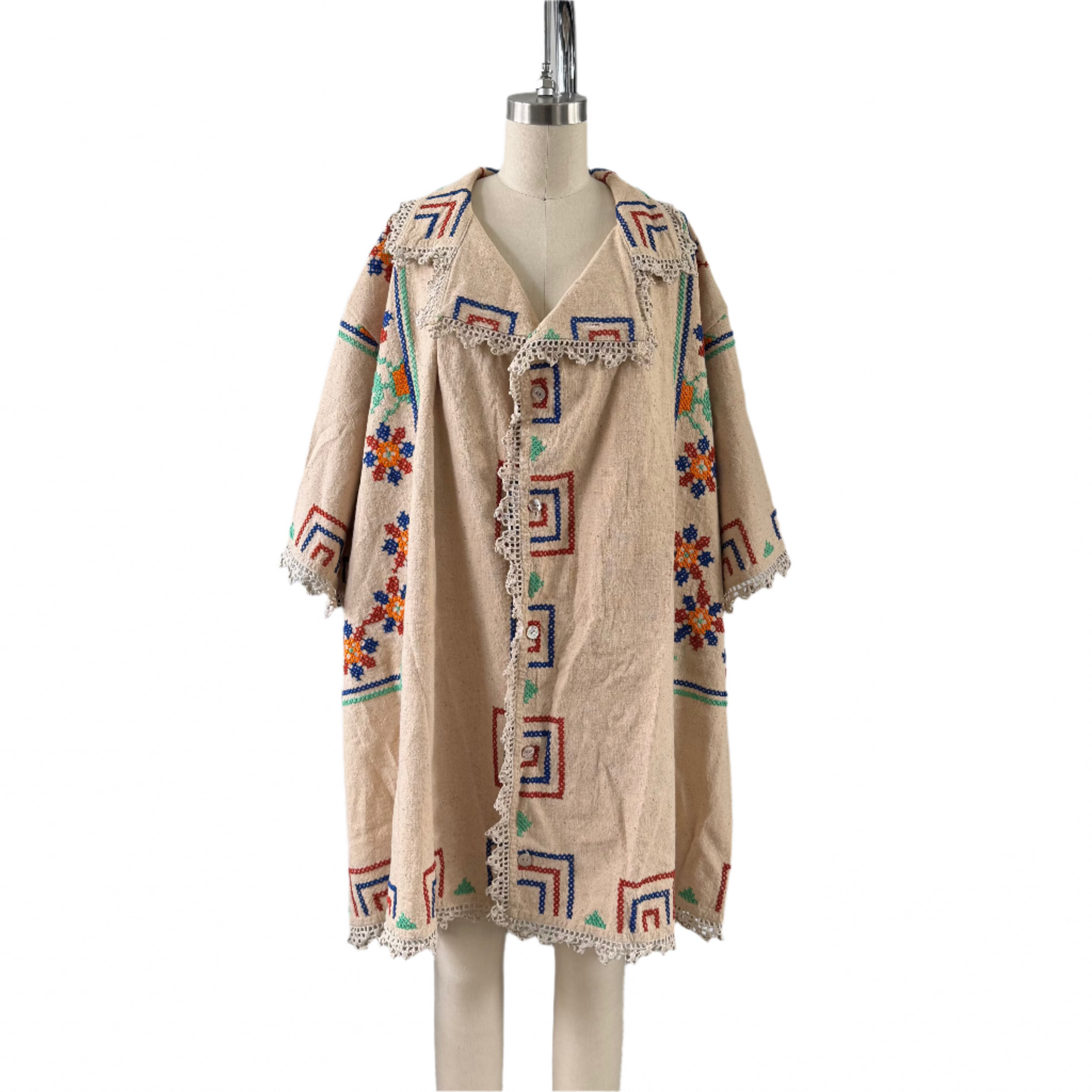 A romantic fusion of form and function, this one-of-a-kind piece transforms effortlessly from coat to dress. Crafted from vintage-found materials and designed with a zero-waste pattern, every inch of fabric is honored—nothing discarded. Delicate floral embroidery dances across the surface, while lace-edged trims add softness and story. Each seam tells a tale of reinvention, making this wearable heirloom a statement in both sustainability and style.
